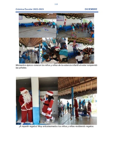 110 Crónica Escolar 2022-2023 DICIEMBRE Momentos épicos vivieron los niños y niñas de la estancia infantil al estar rompiendo las piñatas. ¡A repartir regalos! Muy entusiasmados los niños y niñas recibiendo regalos.