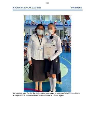 123 CRÓNICA ESCOLAR 2022-2023 DICIEMBRE La subdirectora Cecilia Santiz haciendo entrega a la alumna Karla Ximena Cerón Calleja de 6°B de primaria la Certificación en el idioma Inglés