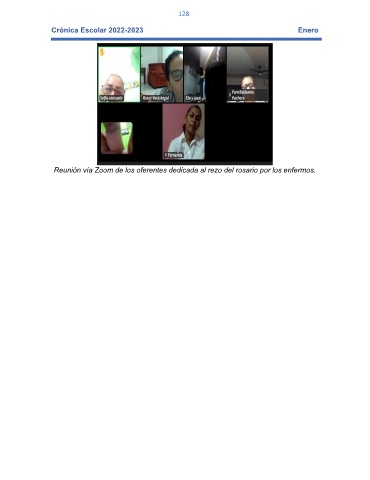 128 Crónica Escolar 2022-2023 Enero Reunión vía Zoom de los oferentes dedicada al rezo del rosario por los enfermos.