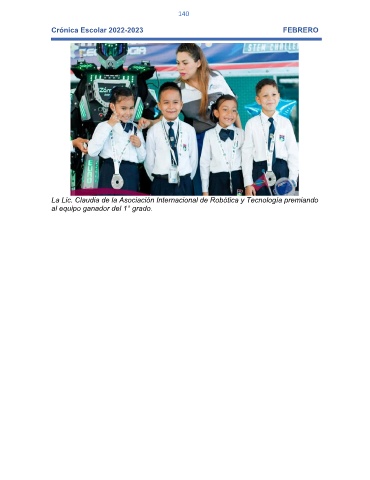 140 Crónica Escolar 2022-2023 FEBRERO La Lic. Claudia de la Asociación Internacional de Robótica y Tecnología premiando al equipo ganador del 1° grado.