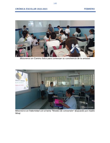 149 CRÓNICA ESCOLAR 2022-2023 FEBRERO Misioneros en Camino listos para comenzar su convivencia de la amistad Misioneros en fraternidad con el tema “Niveles de conversión” (Expuesto por madre Nina)