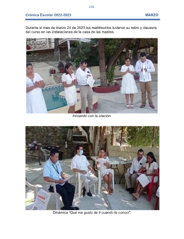 158 Crónica Escolar 2022-2023 MARZO Durante el mes de marzo 24 de 2023 los matrimonios tuvieron su retiro y clausura del curso en las instalaciones de la casa de las madres. Iniciando con la oración. Dinámica “Qué me gusto de ti cuando te conocí”.
