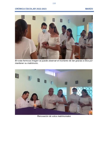 159 CRÓNICA ESCOLAR 2022-2023 MARZO En esta hermosa imagen se puede observar el momento de dar gracias a Dios por mantener su matrimonio. Renovación de votos matrimoniales