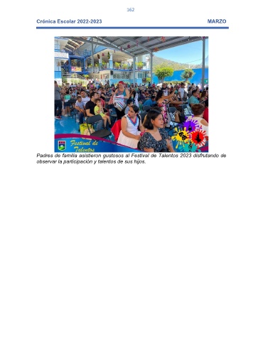 162 Crónica Escolar 2022-2023 MARZO Padres de familia asistieron gustosos al Festival de Talentos 2023 disfrutando de observar la participación y talentos de sus hijos.