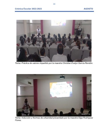 20 Crónica Escolar 2022-2023 AGOSTO Tema: Práctica de valores impartido por la maestra Christian Evelyn García Rendón. Tema: Inducción y Normas de urbanidad presentado por la maestra Olga Rodríguez Flores.