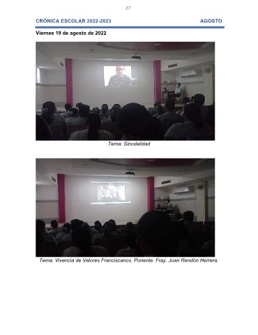 27 CRÓNICA ESCOLAR 2022-2023 AGOSTO Viernes 19 de agosto de 2022 Tema: Sinodalidad Tema: Vivencia de Valores Franciscanos. Ponente: Fray. Juan Rendón Herrera.