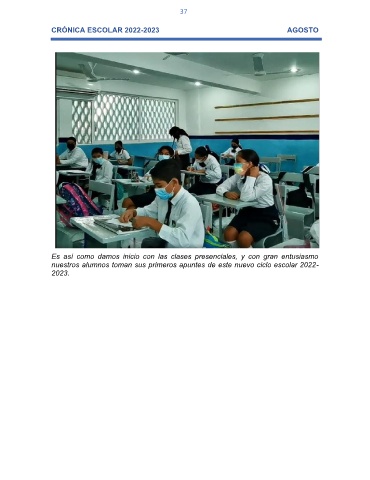 37 CRÓNICA ESCOLAR 2022-2023 AGOSTO Es así como damos inicio con las clases presenciales, y con gran entusiasmo nuestros alumnos toman sus primeros apuntes de este nuevo ciclo escolar 2022- 2023.