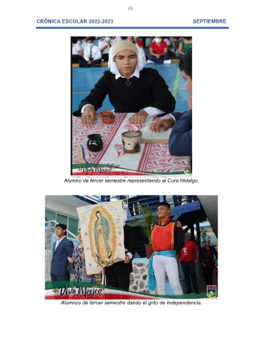 45 CRÓNICA ESCOLAR 2022-2023 SEPTIEMBRE Alumno de tercer semestre representando al Cura Hidalgo. Alumnos de tercer semestre dando el grito de Independencia.