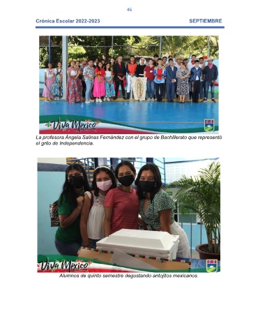 46 Crónica Escolar 2022-2023 SEPTIEMBRE La profesora Ángela Salinas Fernández con el grupo de Bachillerato que representó el grito de Independencia. Alumnos de quinto semestre degustando antojitos mexicanos.