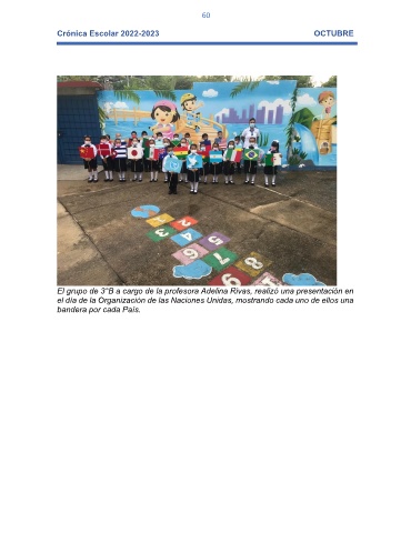 60 Crónica Escolar 2022-2023 OCTUBRE El grupo de 3°B a cargo de la profesora Adelina Rivas, realizó una presentación en el día de la Organización de las Naciones Unidas, mostrando cada uno de ellos una bandera por cada País.