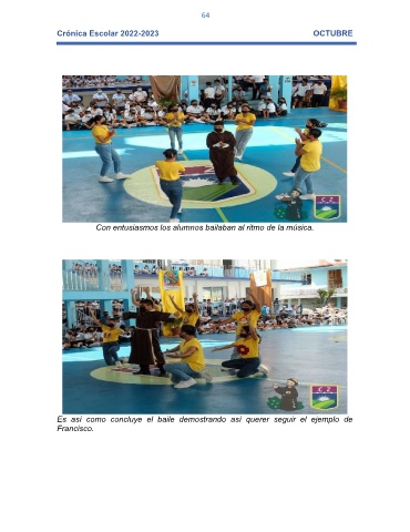 64 Crónica Escolar 2022-2023 OCTUBRE Con entusiasmos los alumnos bailaban al ritmo de la música. Es así como concluye el baile demostrando así querer seguir el ejemplo de Francisco.