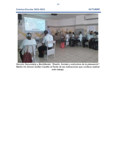 80 Crónica Escolar 2022-2023 OCTUBRE Sección Secundaria y Bachillerato: “Diseño, formato y estructura de la planeación”. Madre Iris Anessi Guillen Castillo al frente de las indicaciones que conlleva realizar este trabajo.