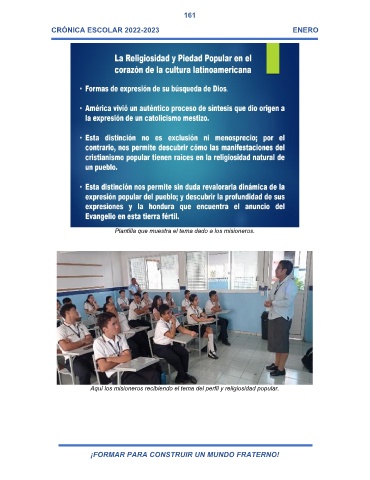 161 CRÓNICA ESCOLAR 2022-2023 ENERO Plantilla que muestra el tema dado a los misioneros. Aquí los misioneros recibiendo el tema del perfil y religiosidad popular. ¡FORMAR PARA CONSTRUIR UN MUNDO FRATERNO!
