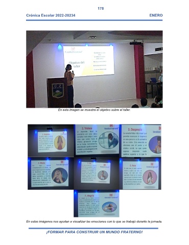 178 Crónica Escolar 2022-20234 ENERO En esta imagen se muestra el objetivo sobre el taller. En estas imágenes nos ayudan a visualizar las emociones con lo que se trabajó durante la jornada. ¡FORMAR PARA CONSTRUIR UN MUNDO FRATERNO!
