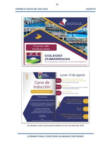 19 CRÓNICA ESCOLAR 2022-2023 AGOSTO Se presenta a todo el personal la invitación al curso de inducción 2023 ¡FORMAR PARA CONSTRUIR UN MUNDO FRATERNO!