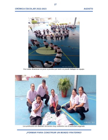 27 CRÓNICA ESCOLAR 2022-2023 AGOSTO Con estas dinámicas se pone a prueba qué tanto se puede trabajar en equipo. Los profesores de distintas secciones muy contentos con la actividad asignada. ¡FORMAR PARA CONSTRUIR UN MUNDO FRATERNO!