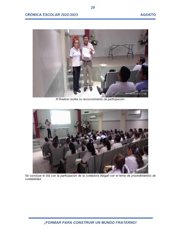 29 CRÓNICA ESCOLAR 2022-2023 AGOSTO Al finalizar recibe su reconocimiento de participación. Se concluye el día con la participación de la contadora Abigail con el tema de procedimientos de contabilidad. ¡FORMAR PARA CONSTRUIR UN MUNDO FRATERNO!