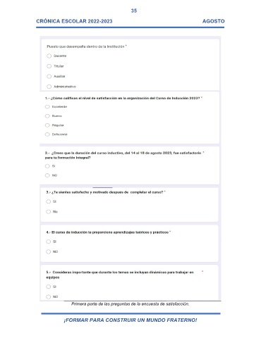 35 CRÓNICA ESCOLAR 2022-2023 AGOSTO Primera parte de las preguntas de la encuesta de satisfacción. ¡FORMAR PARA CONSTRUIR UN MUNDO FRATERNO!