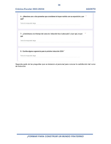 36 Crónica Escolar 2022-20234 AGOSTO Segunda parte de las preguntas que se lanzaron al personal para conocer la satisfacción del curso de inducción. ¡FORMAR PARA CONSTRUIR UN MUNDO FRATERNO!