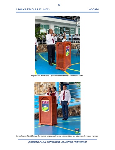 39 CRÓNICA ESCOLAR 2022-2023 AGOSTO El profesor de Música David Israel cantando el Himno nacional. La profesora Yeni Hernández dando unas palabras de bienvenida a los alumnos de nuevo ingreso. ¡FORMAR PARA CONSTRUIR UN MUNDO FRATERNO!