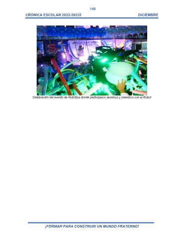 140 CRÓNICA ESCOLAR 2022-20235 DICIEMBRE Celebración del evento de Robótica donde participaron alumnos y maestros con el Robot ¡FORMAR PARA CONSTRUIR UN MUNDO FRATERNO!