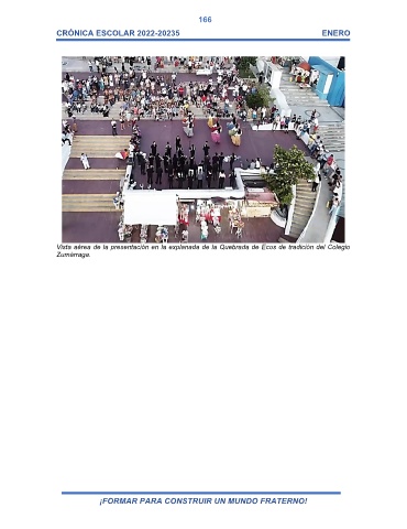 166 CRÓNICA ESCOLAR 2022-20235 ENERO Vista aérea de la presentación en la explanada de la Quebrada de Ecos de tradición del Colegio Zumárraga. ¡FORMAR PARA CONSTRUIR UN MUNDO FRATERNO!